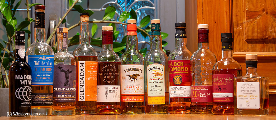 Bei unserem letzten Whiskynasen Stammtisch Ende Februar, haben wir uns seit langen mal wieder einem Thema gewidmet. Mehrheitlich wurde Whisky, der Einfluss eines Madeira Weinfasses hatte, gewählt. Egal ob es sich dabei um eine Vollreifung, eine Mischung oder Finish handelte. Auch das Land und die Region sollte keine Rolle spielen. Der ein oder andere konnte auch einiges zur Thematik, in Form von Whiskyflaschen jeglicher Couleur, beitragen.